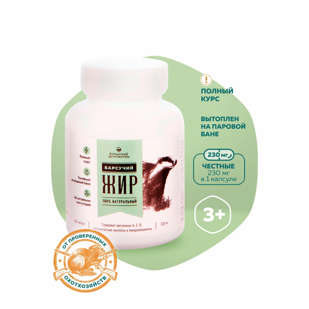 - Капсулы с барсучьим жиром удобно использовать в период сезонной нагрузки на организм — для поддержки комфорта в суставах и спине и общего самочувствия. Взрослым, включая людей старшего возраста, продукт обычно принимают курсами от 1 месяца и дольше; регулярный приём даёт более выраженный эффект. Режим приёма определяется индивидуально.