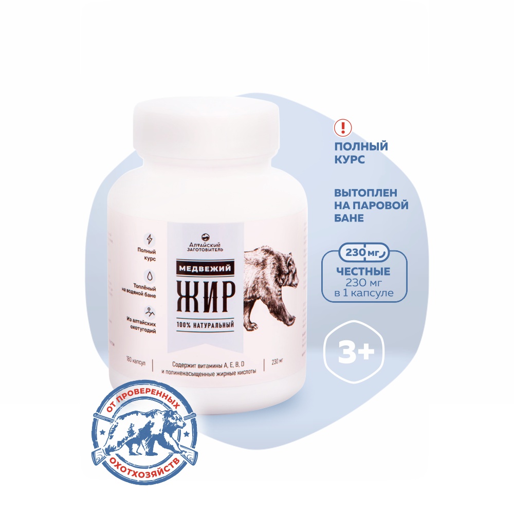 «Алтайский заготовитель» при производстве использует только натуральные ингредиенты, которые прошли тщательную очистку и не содержат вредных примесей. Капсулы содержат пищевой топленый медвежий жир без дополнительных консервантов.